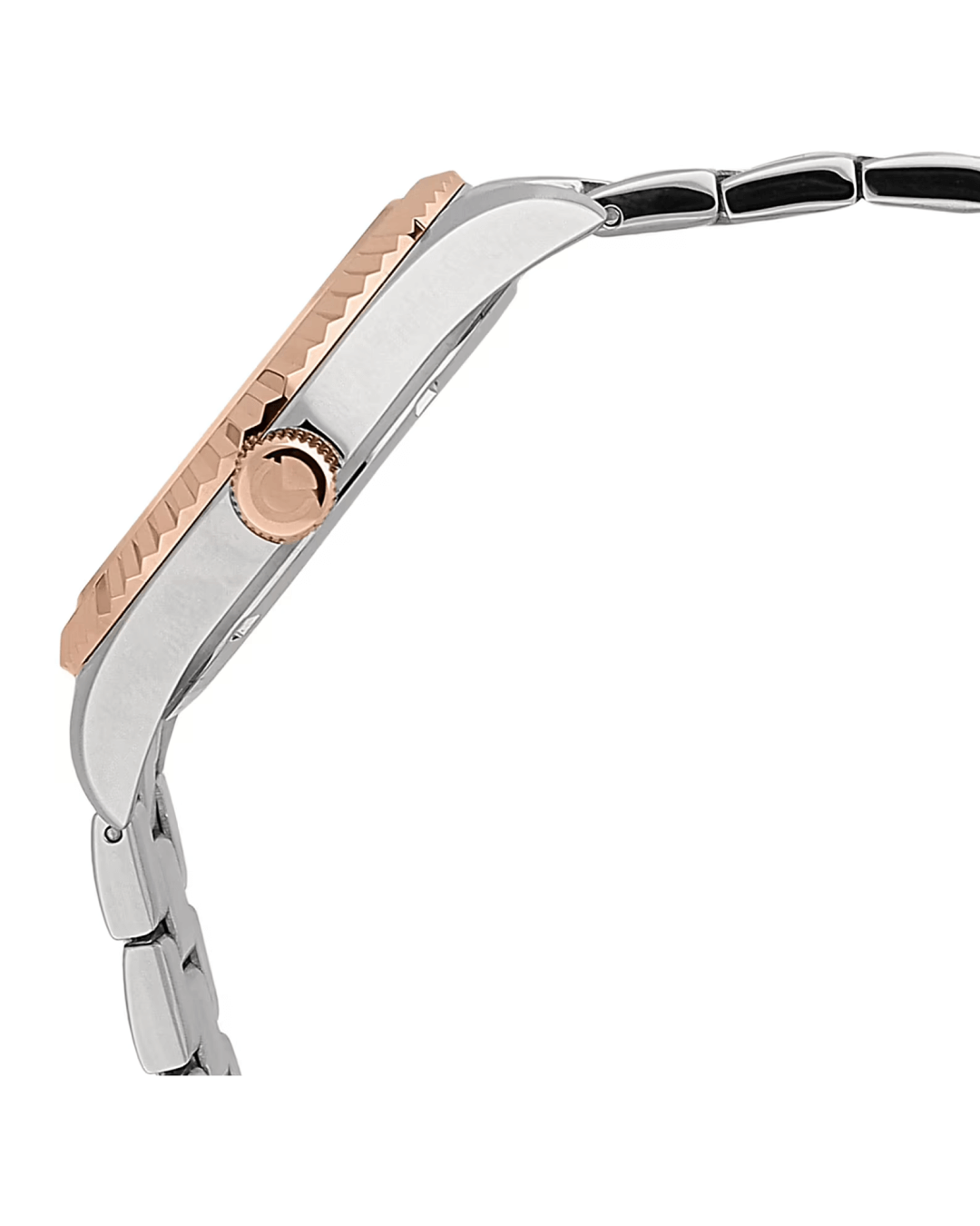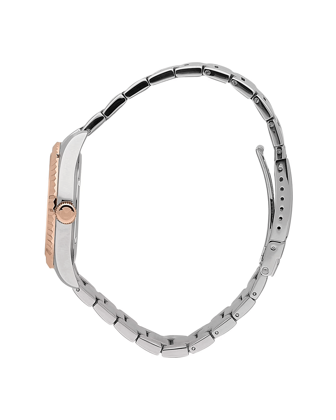 Η κάσα 41 mm από ανοξείδωτο ατσάλι με επίστρωση PVD ροζ χρυσού (pink gold) και πάχος 12,3 mm ξεχωρίζει για το εκλεπτυσμένο της φινίρισμα. Το ορυκτό κρύσταλλο προσφέρει προστασία από γρατσουνιές, ενώ το μεταλλικό μπρασελέ σε ασημί χρώμα ολοκληρώνει το design με σταθερότητα και άνεση.