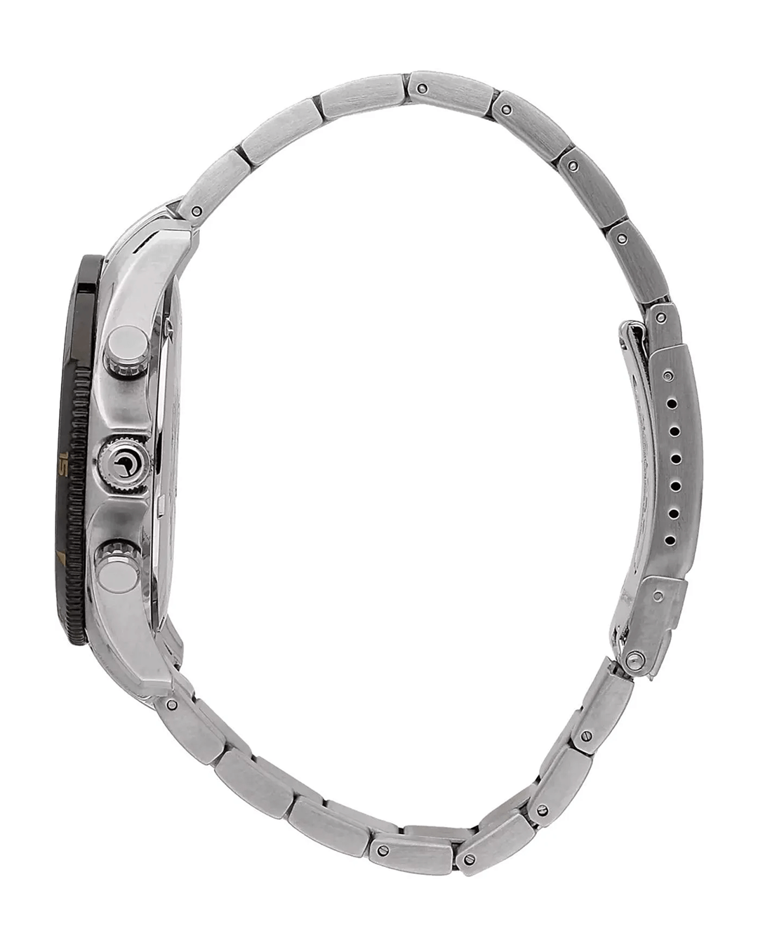 Η κάσα 45 mm και το μπρασελέ είναι κατασκευασμένα από ανοξείδωτο ατσάλι σε ασημί απόχρωση, προσφέροντας στιβαρότητα και κομψότητα. Το μαύρο καντράν με υποκαντράν χρονογράφου και ένδειξη ημερομηνίας δημιουργεί μια έντονη αντίθεση, που αναδεικνύει τον σπορ και μοντέρνο χαρακτήρα του ρολογιού.
