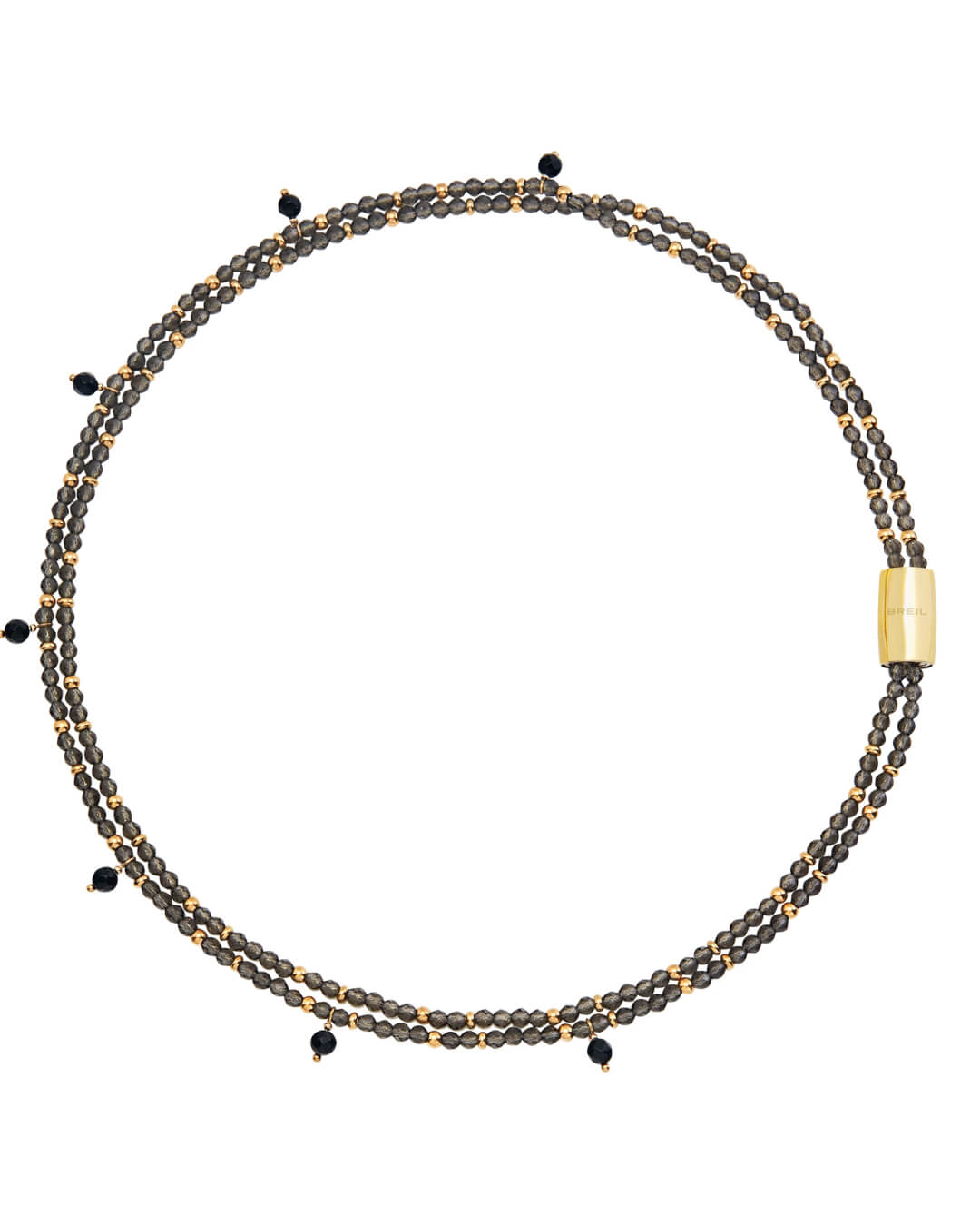 Το κολιέ NY Skyline αποτελείται από δύο αλυσίδες με καπνιστούς κρυστάλλους, χρυσές μικροσφαίρες από ατσάλι και 7 μαύρα φυλαχτά από αχάτη. Μπορεί να φορεθεί μόνο του ή να συνδυαστεί με οποιοδήποτε άλλο στοιχείο της συλλογής για να δημιουργήσει νέα κολιέ διαφορετικού μήκους.